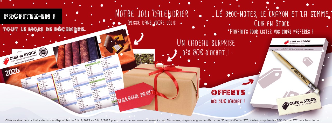 Cuir en Stock est le grossiste de cuir qui vous propose le plus grand choix de cuirs vendus à la peau, en morceau ou au kilo. La majorité de notre stock provient de déstockages : cuirs de fins de séries ou anciennes collections de marques de luxe, grands maroquiniers et marques de chaussures. Le reste de nos cuirs sont des références suivies afin de satisfaire la continuité de vos projets créatifs. Tous les articles proposés sur notre site sont en stock. Nous vous proposons chaque mois de nouvelles références de cuirs, parfois classiques et intemporels, parfois rares et originaux à des prix abordables.