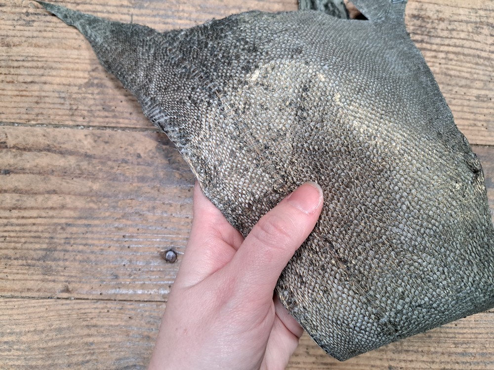 Les peaux de cabillaud proposées ici sont sélectionnées pour leur souplesse, résistance mécanique et leur grain délicat, typique de cette espèce. Grâce à un procédé de transformation maîtrisé, ces peaux conservent une structure fibreuse robuste tout en offrant un toucher léger, flexible et facile à travailler, même sur des pièces de petite dimension.