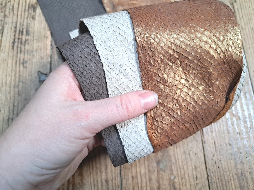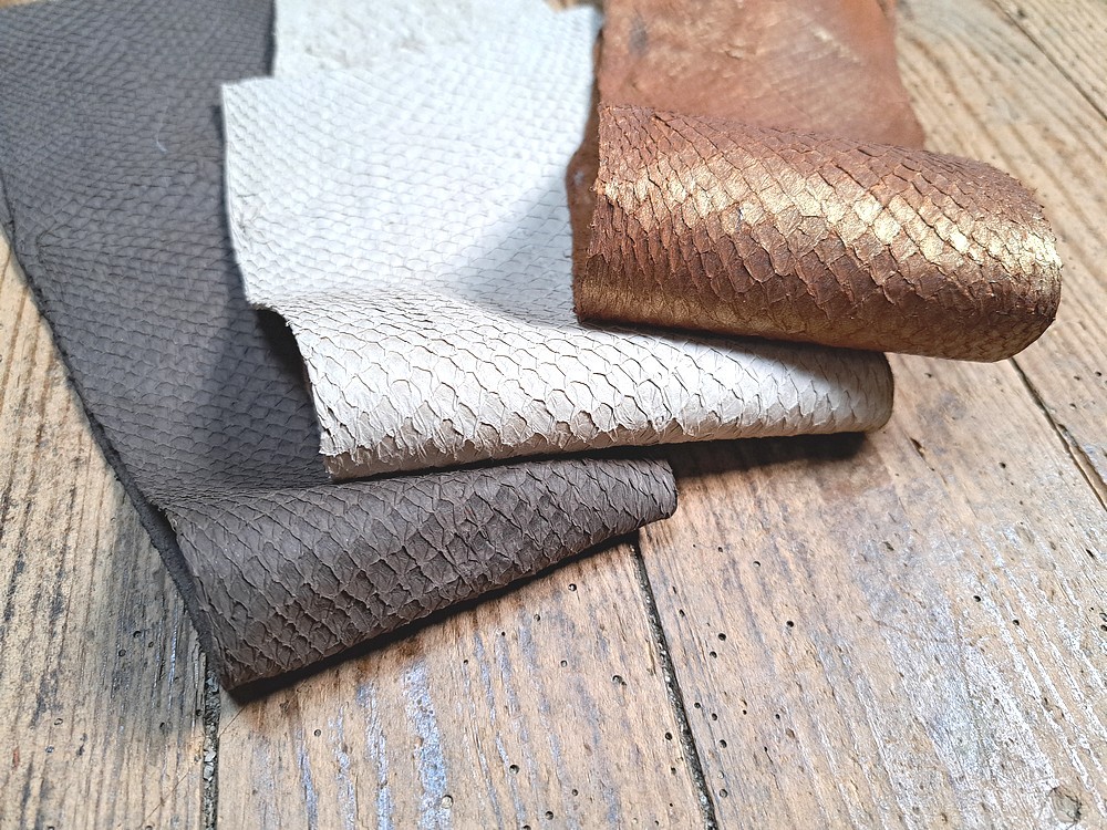 Cuir en stock vous propose une sélection variée de cuirs de poisson.Découvrez notre lot de 3 peaux de cuir de saumon, une matière haut de gamme, résistante et écoresponsable, idéale pour la maroquinerie, les accessoires et les créations artisanales. Le cuir de saumon se distingue par son grain unique, ses écailles apparentes et sa solidité exceptionnelle malgré sa finesse.