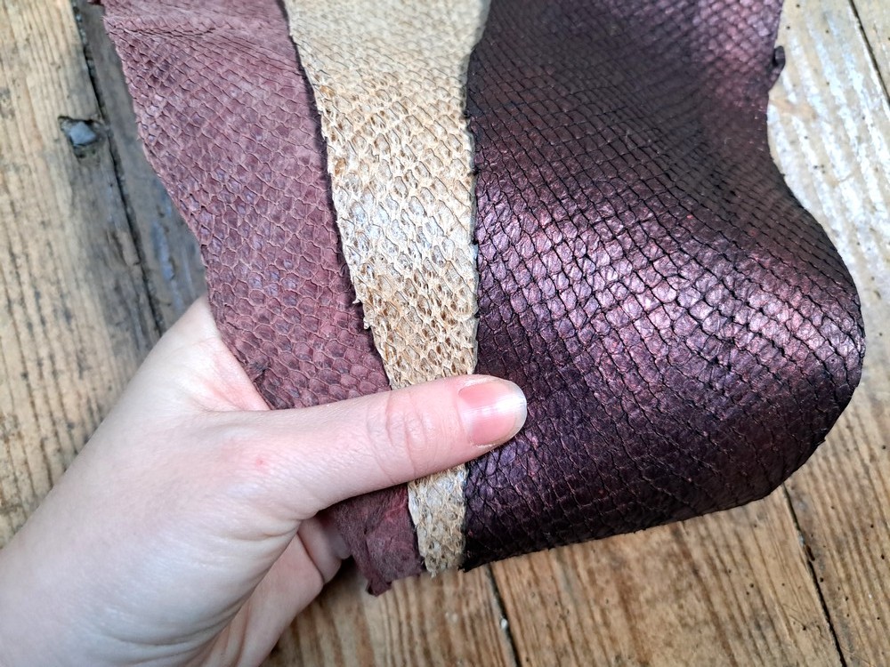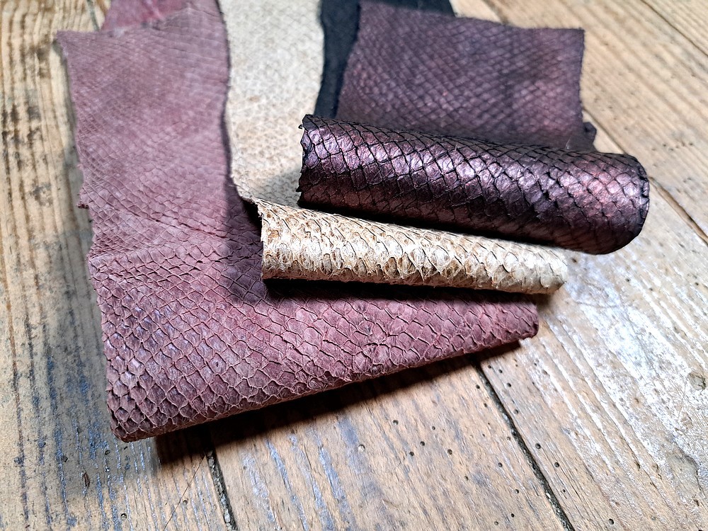 Cuir en stock vous propose une sélection variée de cuirs de poisson.Découvrez notre lot de 3 peaux de cuir de saumon, une matière haut de gamme, résistante et écoresponsable, idéale pour la maroquinerie, les accessoires et les créations artisanales. Le cuir de saumon se distingue par son grain unique, ses écailles apparentes et sa solidité exceptionnelle malgré sa finesse.