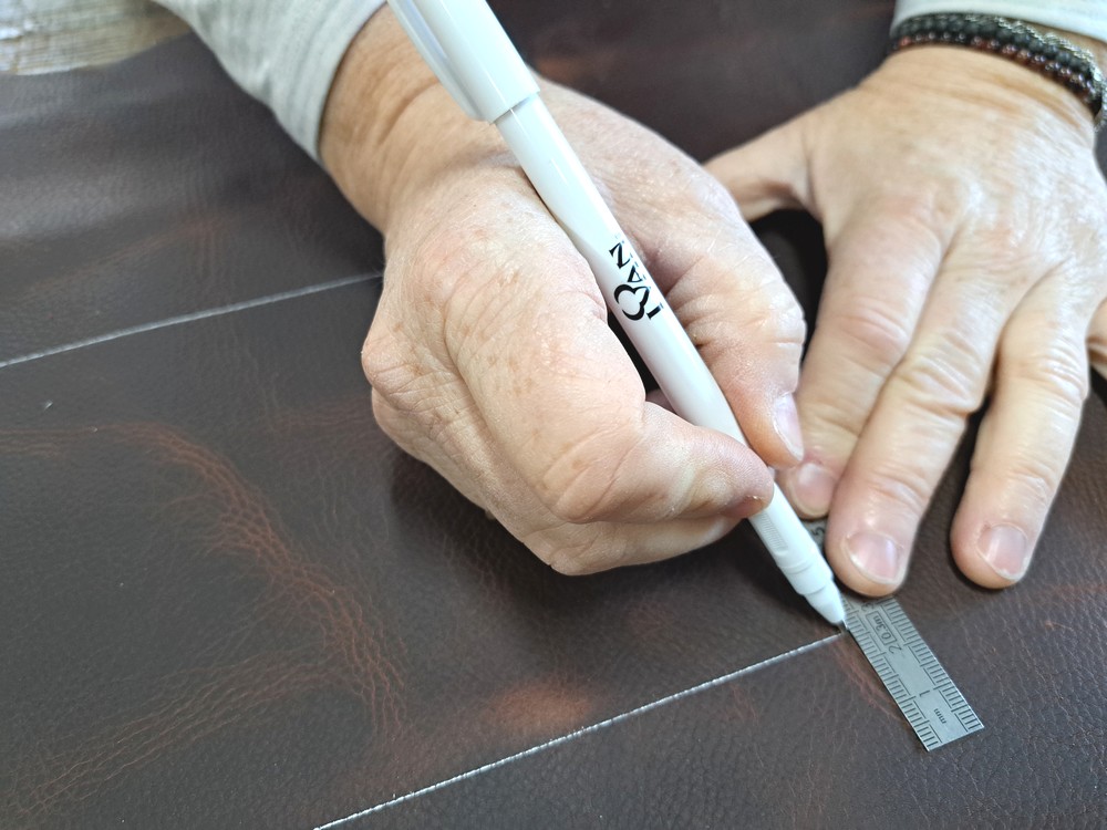 À l’aide d’un crayon argent spécial cuir, tracez deux rectangles sur vos morceaux de cuir.