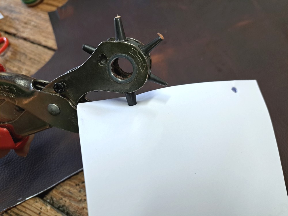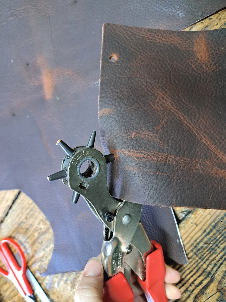 Marquez ensuite l’emplacement des trous sur les deux rectangles de cuir :