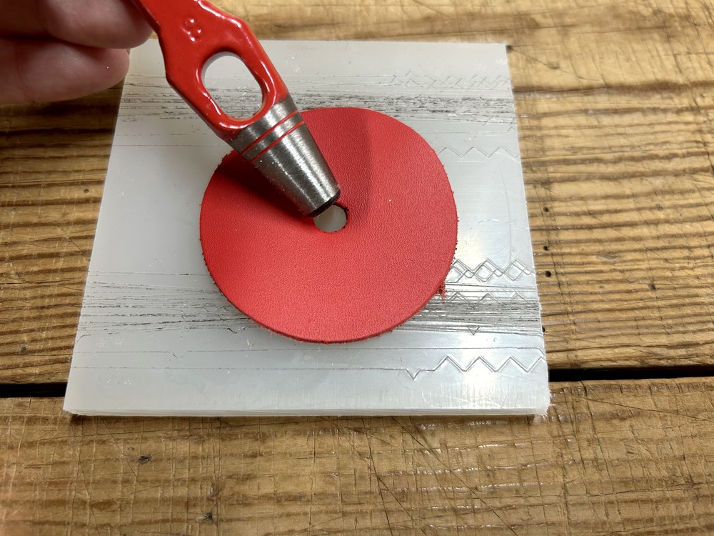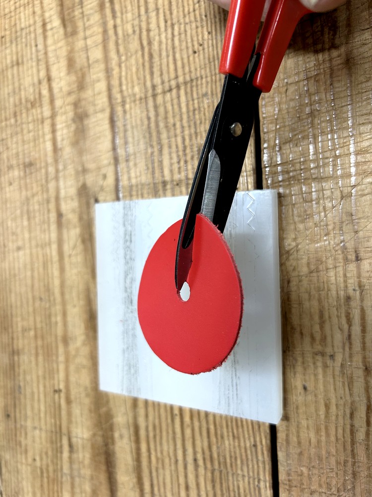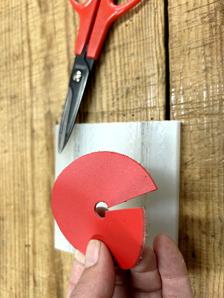 Avec une paire de ciseaux pour cuir, découpez une encoche droite depuis le bord du rond jusqu’au trou réalisé précédemment.