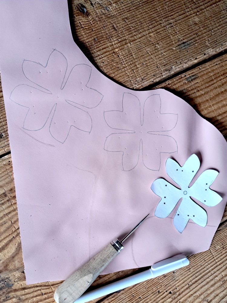 Commencez par imprimer le patron. Découpez le soigneusement, puis posez le sur votre morceau de cuir. Tracez les contours au stylo ou à l’aide d’un crayon adapté. Pour les pétales, il vous faudra deux pièces identiques.