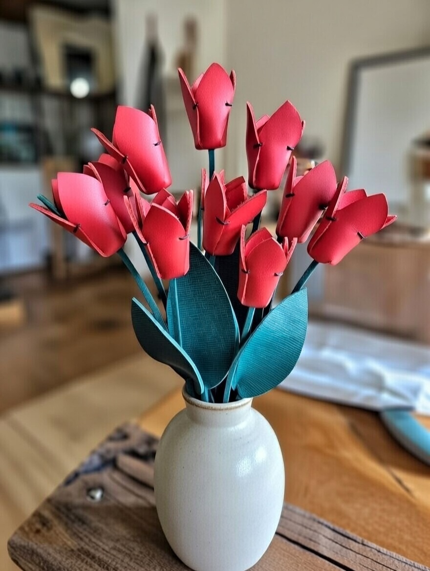 Votre bouquet de tulipes en cuir est maintenant terminé, prêt à embellir un sac, un trousseau de clés ou même à devenir un petit cadeau unique et fait main. Ce tutoriel vous permet de découvrir le plaisir de travailler le cuir, d’apprendre à manipuler les pétales et les tiges, et de créer un accessoire durable et élégant.