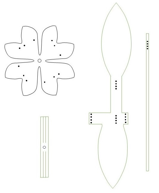À l’aide d’une pince revolver perforatrice réglée sur le diamètre minimum, ou d’une alêne, percez les pétales en suivant exactement les repères indiqués sur le patron. Ces trous permettront ensuite l’assemblage propre et solide de la tulipe.
