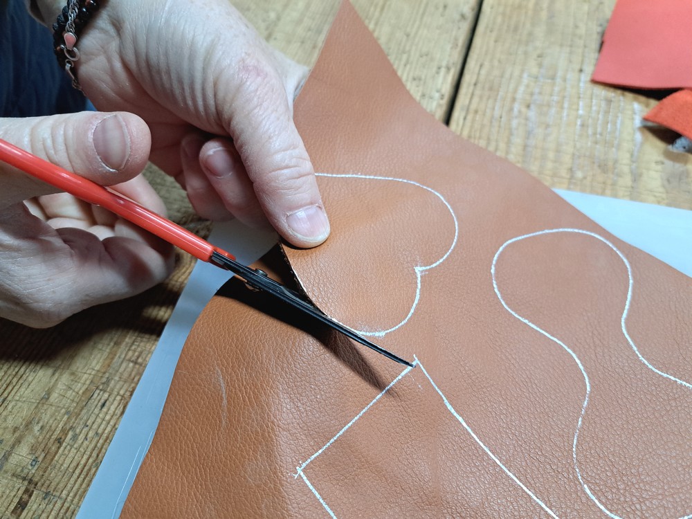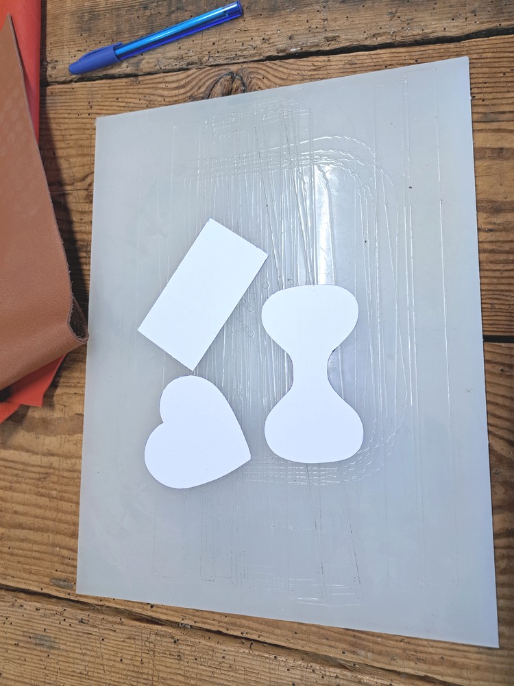 À l’aide de votre patron en papier et de votre stylo effaçable spécial cuir, tracez la forme choisie sur vos différentes chutes.