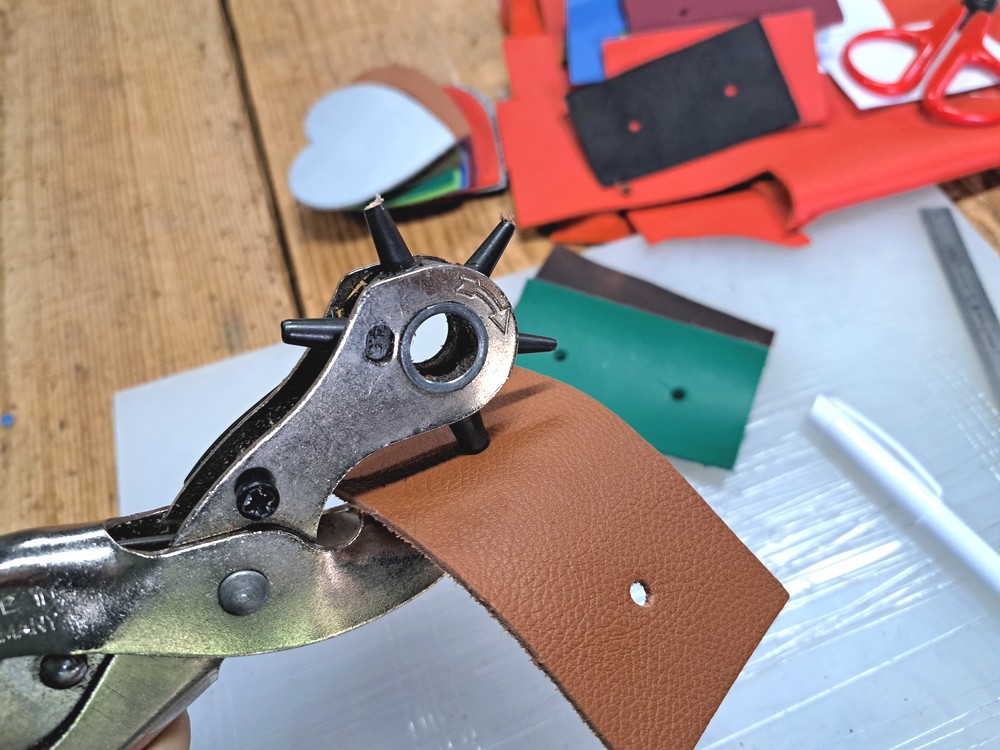 Une fois les emplacements repérés, percez le premier morceau de cuir à l’aide de votre pince perforatrice, puis utilisez-le comme gabarit pour reporter le trou sur tous les autres morceaux.