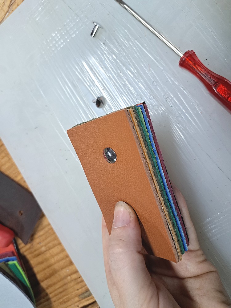 Commencez par insérer la partie femelle de la vis Chicago (celle avec le pas de vis) à travers vos morceaux de cuir.