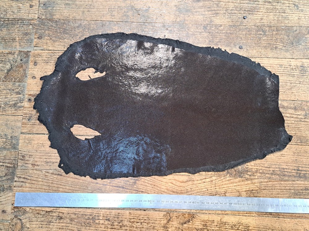 Le galuchat est un cuir exotique d'exception grâce a son grain et ses perles blanches centrales uniques, appelées aussi couronne