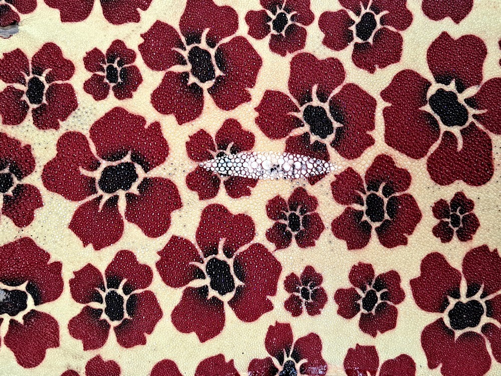 Le galuchat est un cuir exotique d'exception grâce a son grain et ses perles blanches centrales uniques, appelées aussi couronne