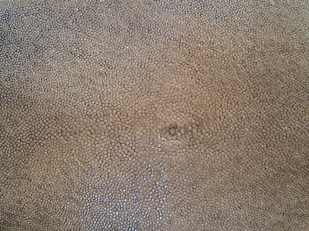 Le galuchat est un cuir exotique d'exception grâce a son grain et ses perles blanches centrales uniques, appelées aussi couronne