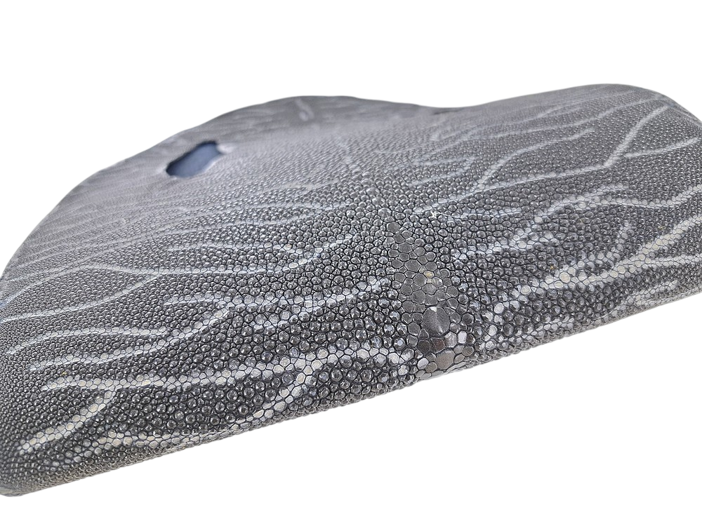 Le galuchat est un cuir exotique d'exception grâce a son grain et ses perles blanches centrales uniques, appelées aussi couronne