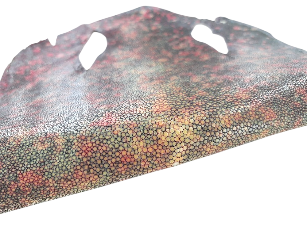 Le galuchat est un cuir exotique d'exception grâce a son grain et ses perles blanches centrales uniques, appelées aussi couronne