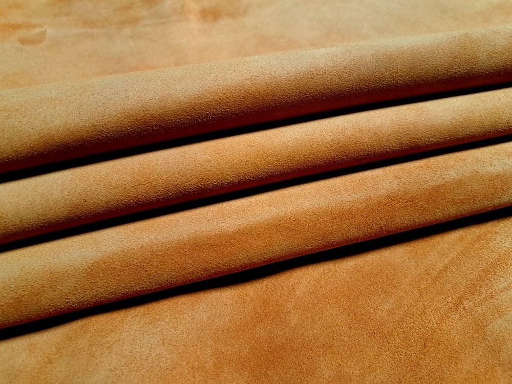 Elle passe alors dans une velouteuse, une machine industrielle équipée de cylindres abrasifs, qui vient poncer finement la surface du cuir. Cette opération permet d’obtenir un aspect velours régulier, au toucher doux, soyeux et mat, caractéristique de ce type de cuir. Le travail de veloutage est réalisé de manière uniforme afin de garantir une surface agréable et esthétique sur l’ensemble de la peau.